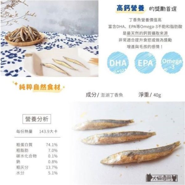 商品詳情 使用RO逆滲透過濾水洗的澎湖丁香魚冷凍乾燥零食, 無香料及添加物,純粹的天然食材帶給毛孩減鹽、少負擔的丁香魚鮮味! *特選5-7cm大尾丁香魚 *少鹽少負擔 *高鈣營養DHA、EPA、Omage-3 *冷凍乾燥製成保持原有營養 重量:40g 卡尼-澎湖海味丁香魚凍乾 TWD $260 TWD $260